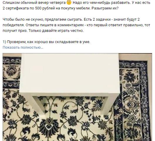 Мы размещали пост с конкурсом на трёх площадках города: «Новости», «Розыгрыши» и «Конкурсы». Обошлось нам это в 670 ₽. Это помогло распространить конкурс в широкие массы, пока он ещё не набрал обороты. Потом нам оставалось лишь наблюдать за естественным распространением.В итоге от этого конкурса мы получили:- 3 покупателя, которые получили сертификат и пришли потом за мебелью;- 255 лайков, 63 репоста (это результат через 2 месяца после завершения конкурса, многие удаляют репосты, поэтому реальная цифра должна быть больше);- более 150 целевых подписчиков.