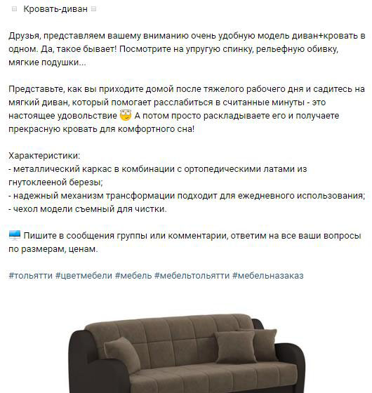 Возникает ряд вопросов: какую соцсеть выбрать, какой будет стратегия продвижения и т.д. Расскажем как это было у нас.Наша компания занималась продажей мебели сегмента «эконом+», основная аудитория в точках продаж — пенсионеры. Конкурентов с мебелью этого класса на рынке много, соперничать с крупными игроками, как вы понимаете, довольно трудно, а отстроиться от конкурентов необходимо. Поэтому решили пойти двумя путями:1. Придумать уникальное торговое предложение, которое выделит нас среди толпы конкурентов.2. Выйти на новую целевую аудиторию, более молодую.Мы решили создать одну страницу в соцсети и тщательно работать с ней, поэтому пришлось выбирать из разных вариантов что-то одно. Остановились на «ВКонтакте», потому что там сконцентрирована наша целевая аудитория, которую мы планировали охватить.